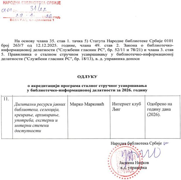 После великог успеха семинара „МАПА ПУТА ЧИТАЊА У ДИГИТАЛНИМ УСЛОВИМА“ (акредитован са 6 бодова код Народне библиотеке Србије за 2025. годину) новим семинаром конкретизује формирање и коришћења дигиталних ресурса јавних библиотека. по моделу, internet.edu.rs. ( Код НБС је у току поступак акредитације за 2026. годину)